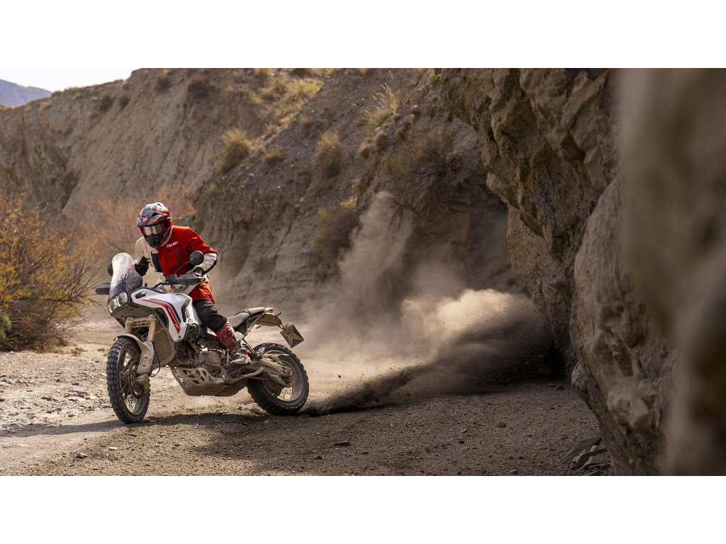 Srdcem DesertX je nový dvouválec Ducati V2 o objemu 890 cm³ — nejlehčí twin, jaký kdy značka vyrobila. Nabízí 110 koní a hlavně 70 % maxima točivého momentu už ve 3000 ot./min. Právě tahle okamžitá dostupnost síly je klíčová v terénu: motorka reaguje na první dotek plynu, pomáhá překonávat překážky a zároveň poskytuje hladký, příjemný zátah na silnici. Univerzální motor, který tě podrží v každé situaci.